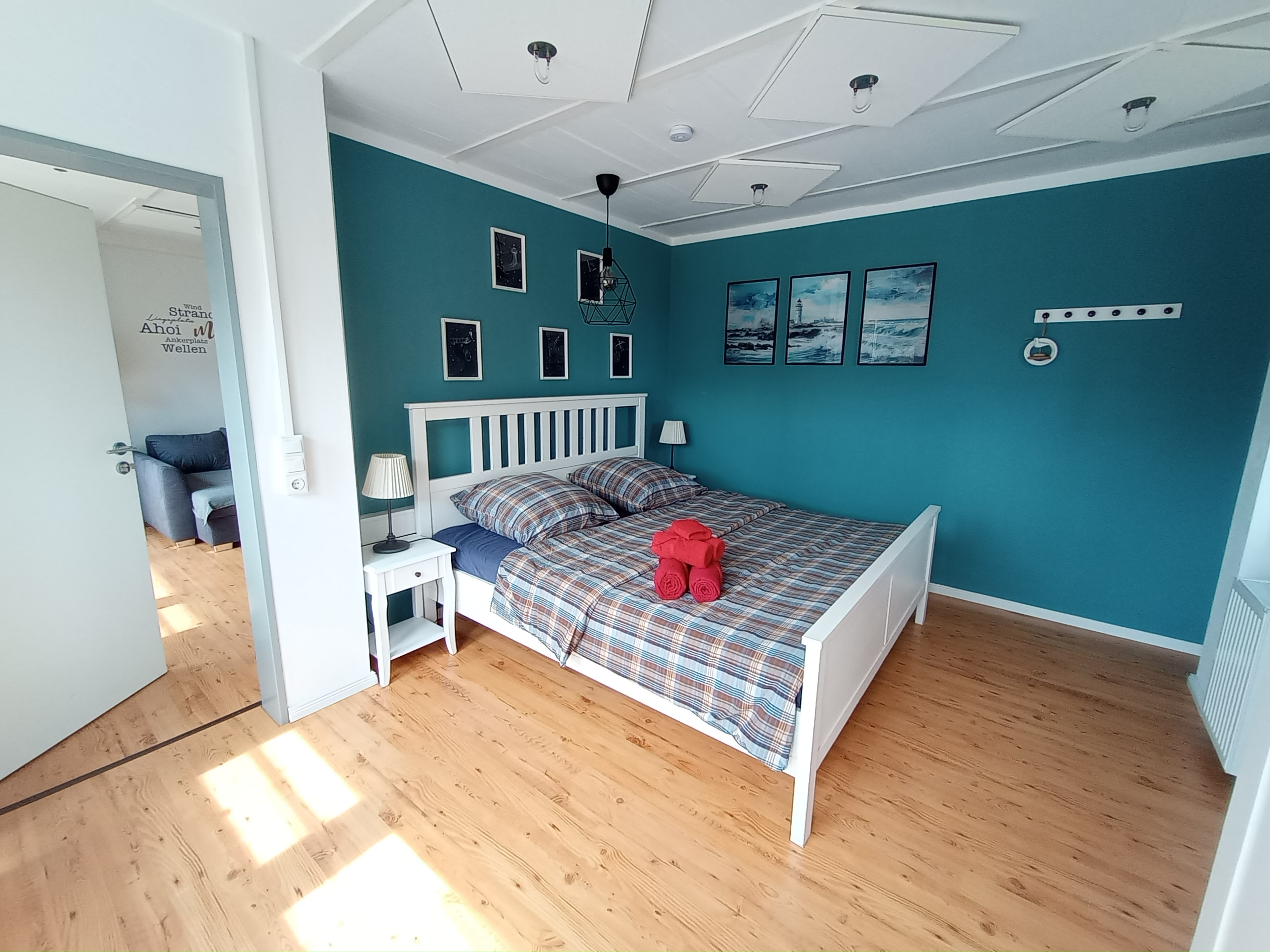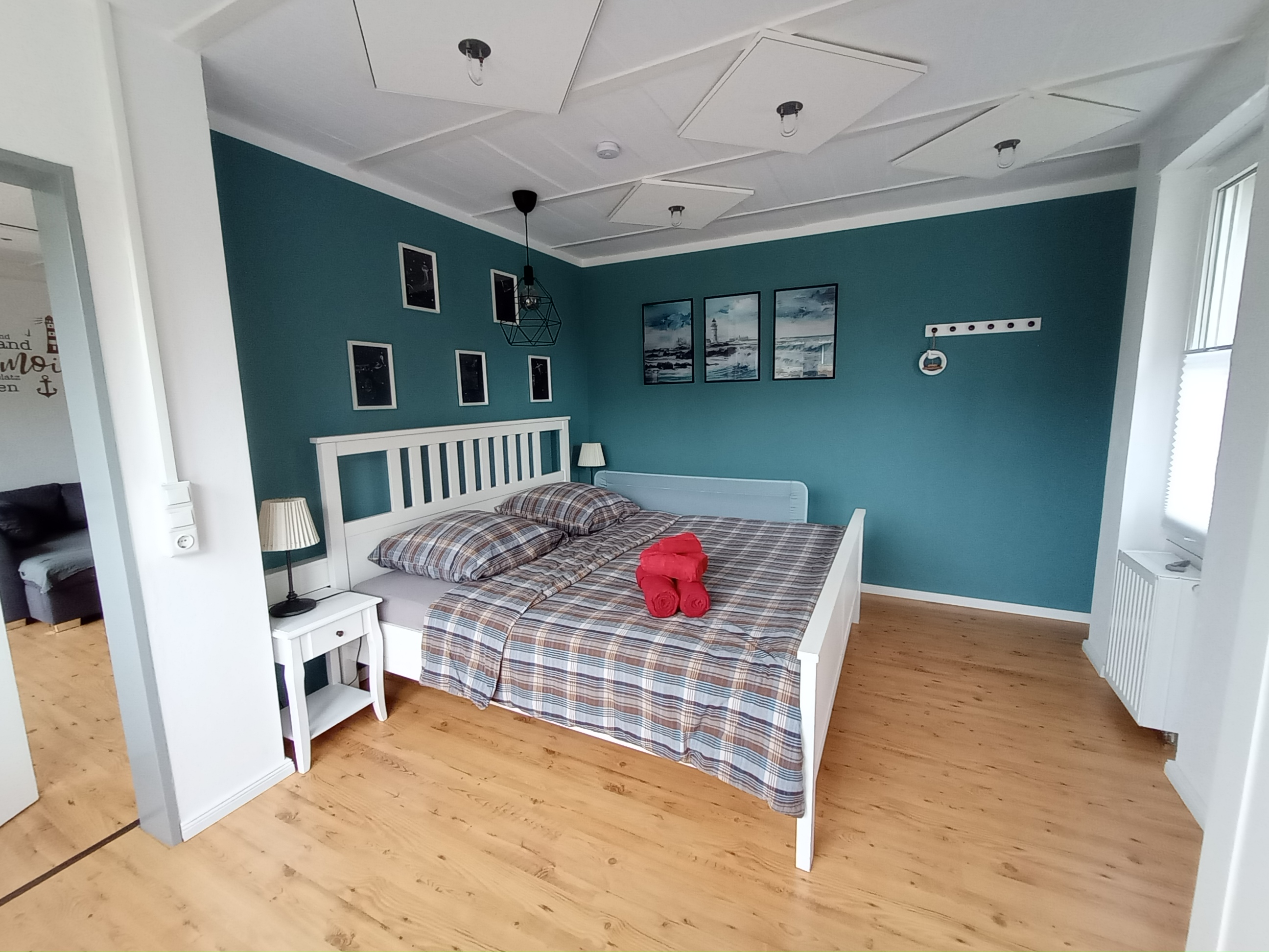 Das gemütliche Bett hat eine großzügige Größe von 180×200 cm und sorgt für erholsame Nächte. Bei Bedarf kann ein Rausfallschutz für Kleinkinder zur Verfügung gestellt werden. Ein Kinderreisebett steht bei Bedarf ebenfalls zur Verfügung.