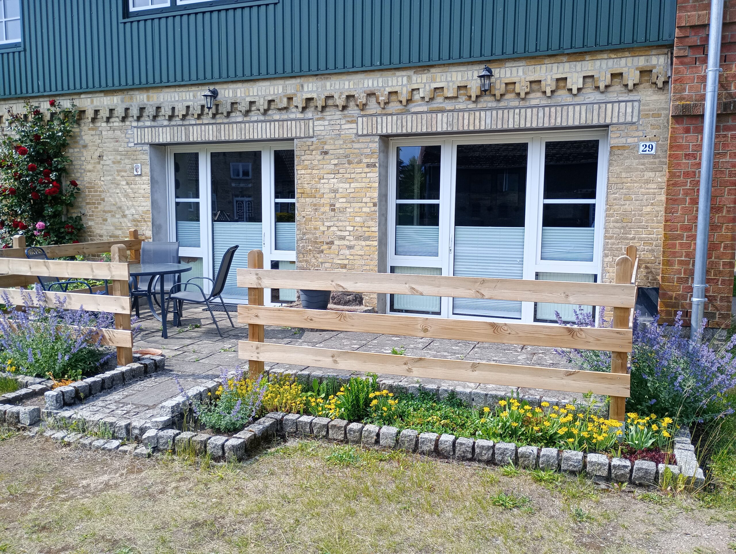 Auf der eigenen Südterrasse befinden sich Sitzgelegenheiten und ein Grill.