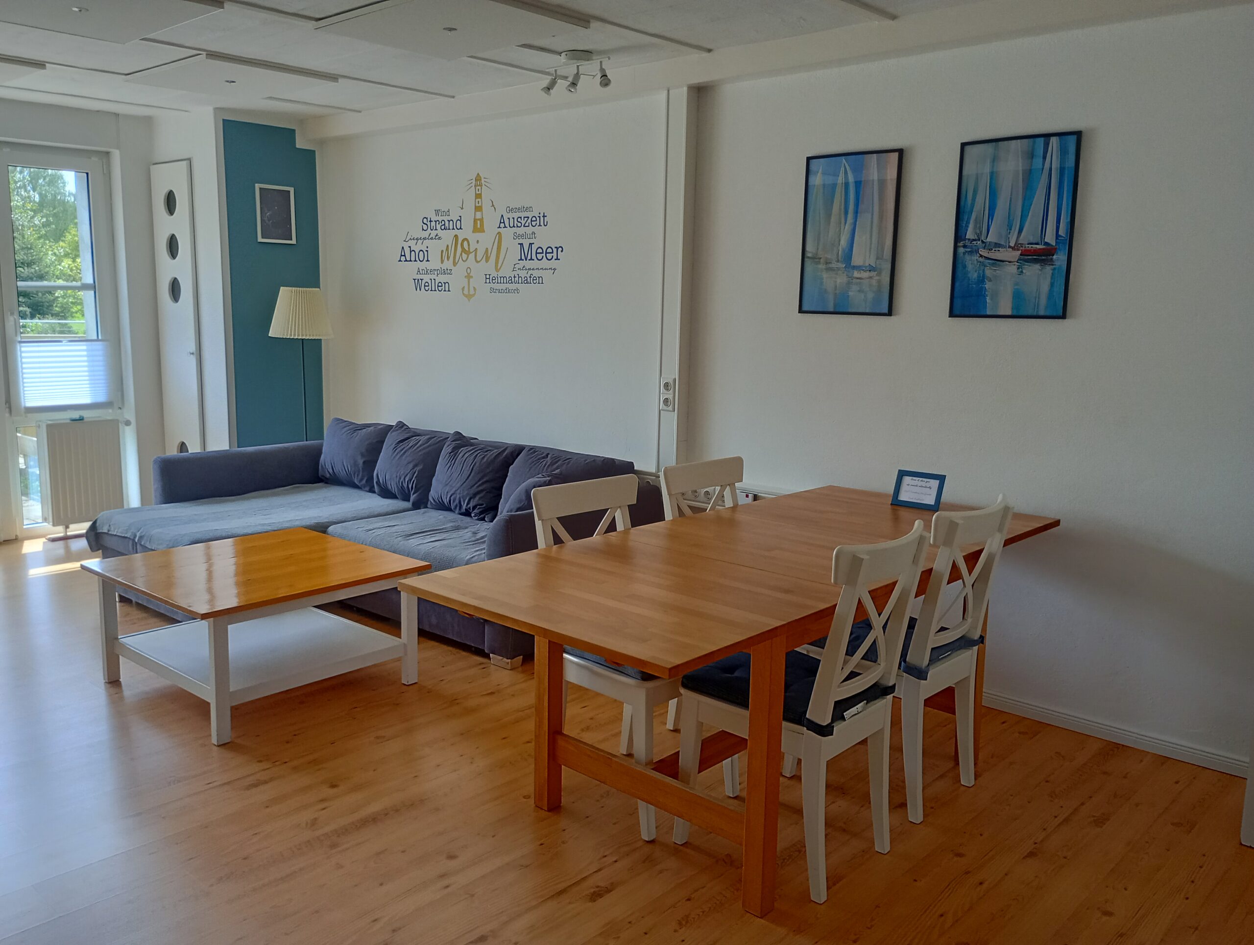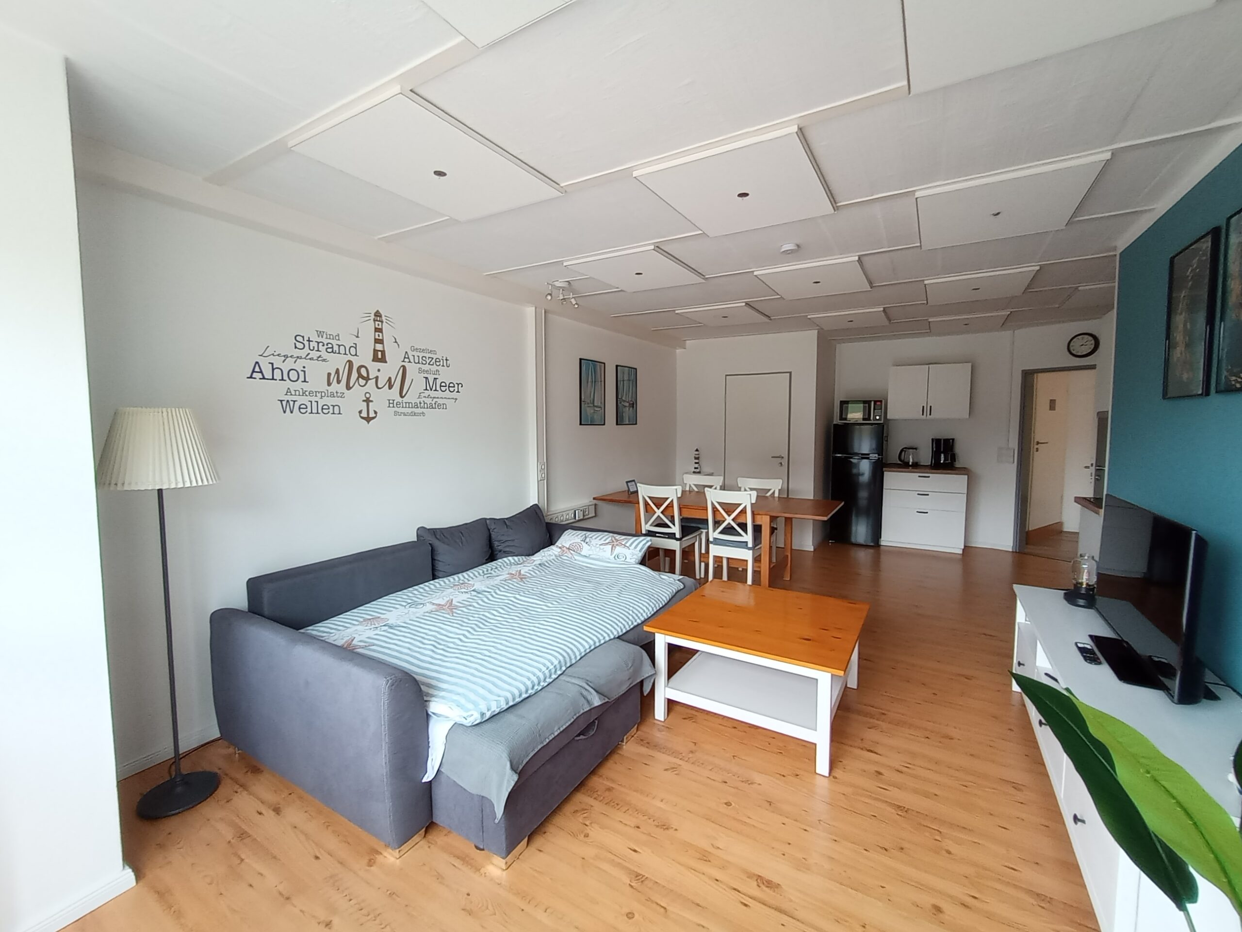 Das Sofa lässt sich ausklappen und ist mit einer Liegefläche von 140×200 cm für einen weiteren, erwachsenen Gast oder zwei Kinder geeignet.